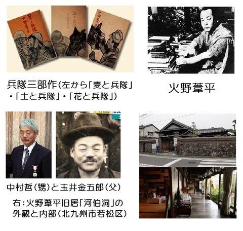※火野葦平と中村哲:パキスタン・アフガニスタンで医療や用水路建設などの人民救済活動を展開し、2019年に銃撃され死亡した中村哲(なかむら・てつ)氏は、火野葦平の妹の子。中村氏は生前、自身の活動には祖父・玉井金五郎から受け継いだ血が影響している、と語っています。
