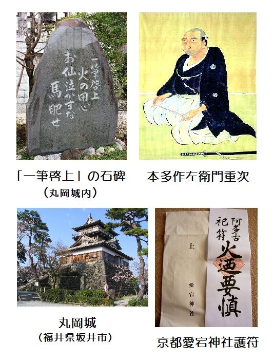 ※「火の用心」というフレーズですが、京都の愛宕神社(全国の愛宕神社の総本宮)はじめ、主に京都の寺社で「火迺要慎」や「火乃要慎」の護符が古くからあることから、本多重次が最初に考えたフレーズではなさそうです。